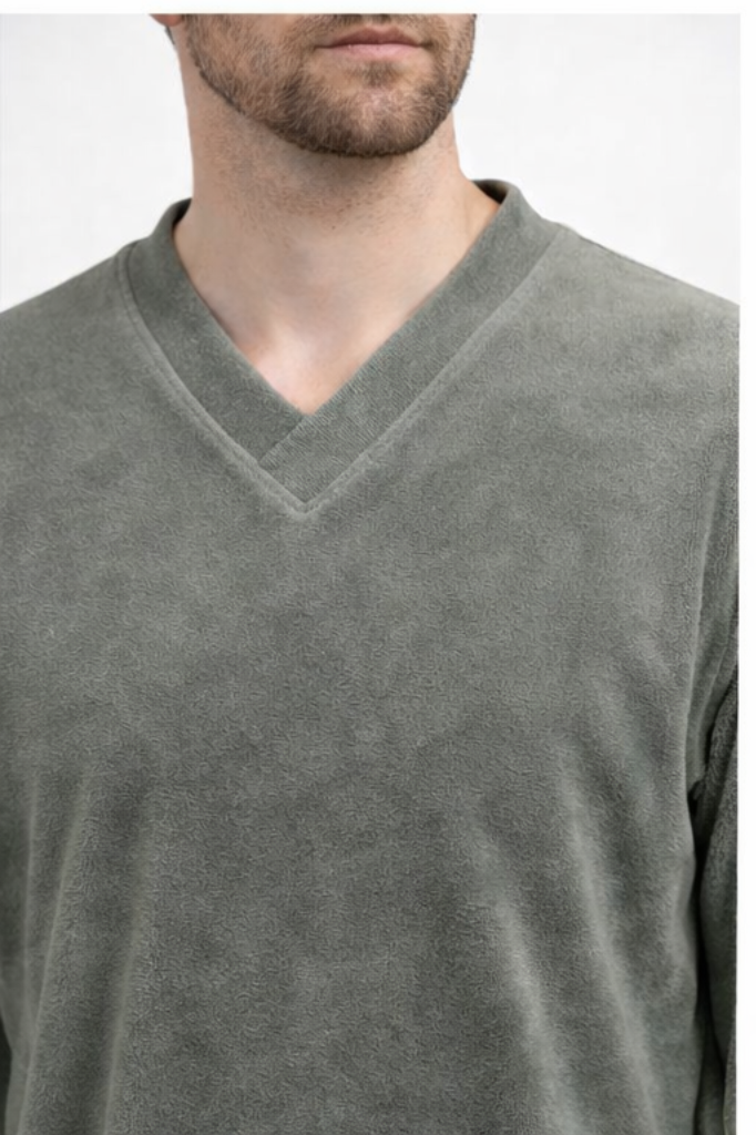 Moška pižama iz frotirja je odlična izbira za hladnješe dni in sproščene večere doma. Izdelana je iz turškega frotirja, ki slovi po svoji kvaliteti in trpežnosti. Pižama ima V-izrez in patente na nogah, rokah in v pasu.